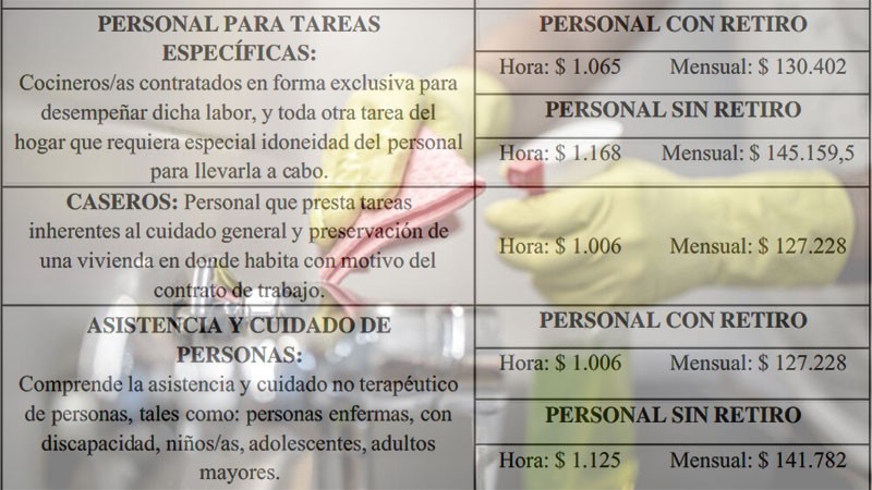 -- Personal para tareas generales (limpieza, lavado, planchado, mantenimiento, elaboración y cocción de comidas y, en general, toda otra tarea típica del hogar): Personal con retiro, $932,5 por hora y $114.415 mensual; Personal sin retiro, $1.006 por hora y $127.228 mensual.