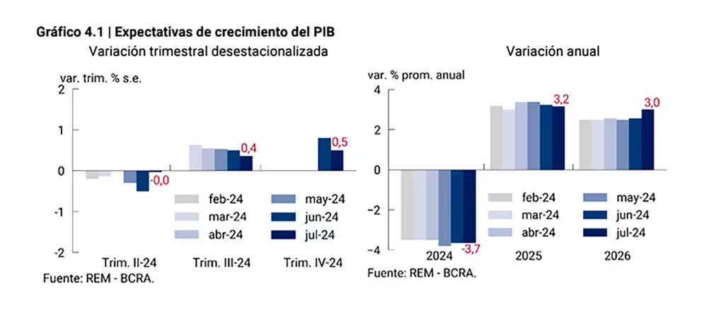 Con respecto a la proyección de crecimiento económico, el informe del Central casi no mostró diferencias en relación al mes anterior. “En el relevamiento de julio, el conjunto de analistas del REM proyectó para 2024 un nivel del Producto Interno Bruto (PIB) real 3,7% inferior al promedio de 2023, igualando la perspectiva respecto del relevamiento previo”, apuntó el BCRA. En este sentido, la proyección de los analistas se asemeja bastante con lo proyectado por el propio Gobierno.