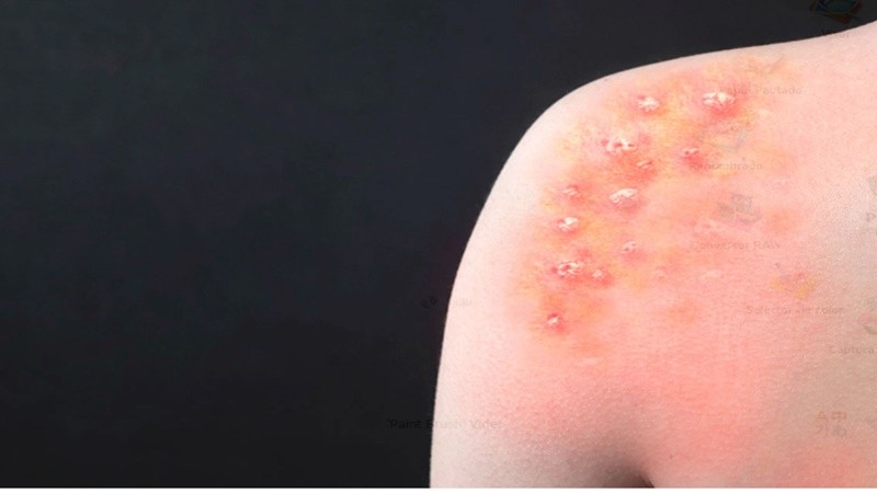 -Lesiones en la piel o mucosas: manchas rosadas planas o sobreelevadas, úlceras, ampollas o costras.