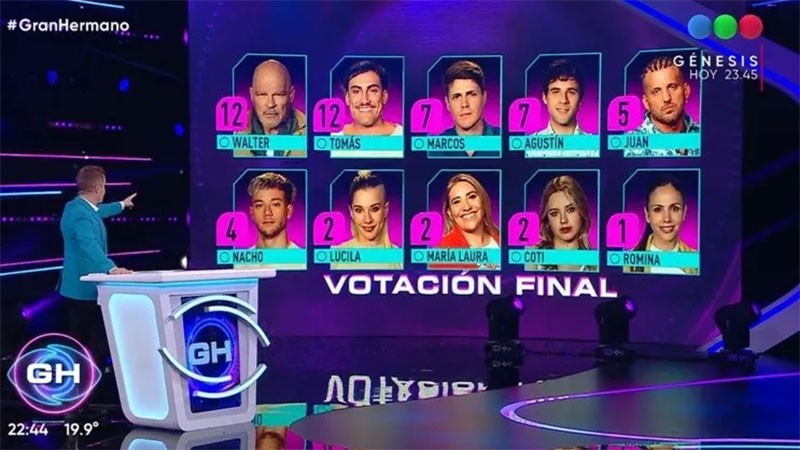La placa final quedó con 12 votos para Walter Alfa, 12 para Tomás, 7 para Marcos y 7 para Agustín. Este es el poker de nominados que el público de Gran Hermano puede votar para eliminar a uno el próximo domingo. El resto de la votación quedó en 5 puntos para Juan, 4 para Nacho, 2 para Lucila, 2 para María Laura, 2 para Coti y uno para Romina.
