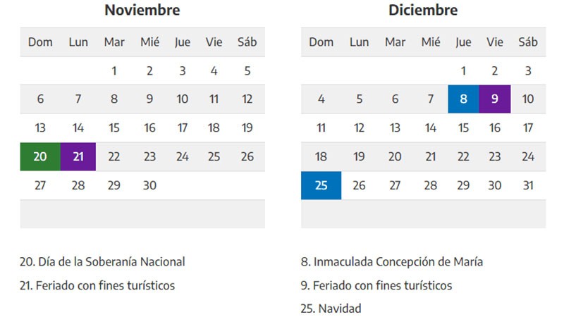 Quedan cinco feriados en lo que resta del año, pero dos de ellos tienen una particularidad: caen domingo. Se trata del próximo 20 de noviembre, que será feriado por el Día de la Soberanía Nacional pero tendrá un agregado, puesto que el lunes 21 fue declarado “feriado con fines turísticos”, por lo que será un fin de semana largo.
