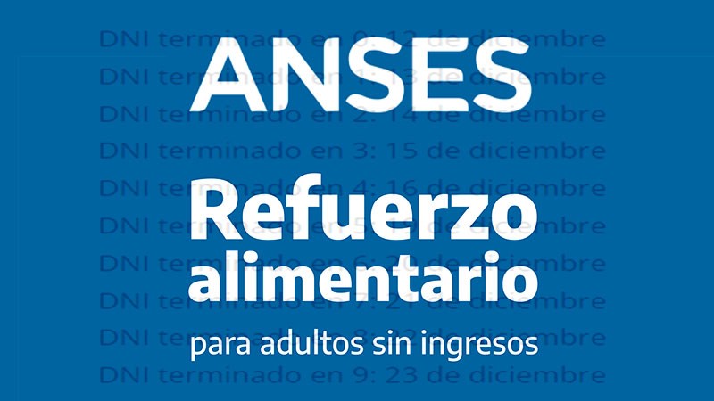 ANSES informa que, desde el próximo lunes 12 de diciembre, comienza el pago de la segunda cuota del Refuerzo Alimentario ($22.500) para adultos sin ingresos, según terminación de DNI.