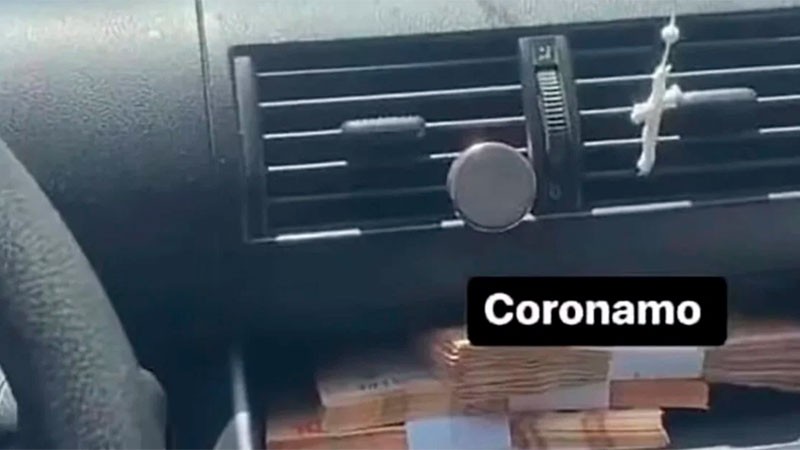 Garbino, minutos después, decidió compartir con sus seguidores la obtención del botín con una foto de fajos de billetes de 10 mil en la guantera de su auto, con la leyenda “coronamo”. Un rosario termina de decorar la “pintura” difundida en las redes sociales.