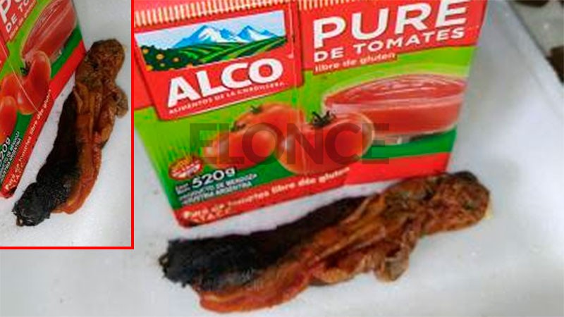 “Ayer, mi mamá compró una caja de puré de tomate marca ALCO y hoy iba a hacer guiso, pero notó algo raro dentro del envase”, referenció Diego al dialogar con Elonce y agregó que, del tetrabrik, “salió un pedazo de algún animal. No sé si será una rata o un murciélago”, remarcó sobre el asqueroso hallazgo.