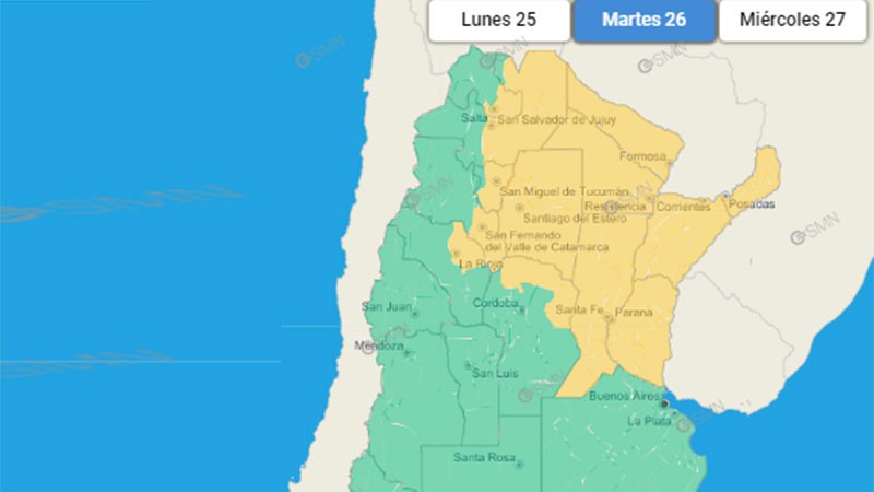 El Servicio Meteorológico Nacional emitió una alerta por tormentas para el martes en Entre Ríos, Santa Fe, Corrientes, Misiones, Formosa, Santiago del Estero, partes de Tucumán, Córdoba, Catamarca, Salta, Jujuy y La Rioja.