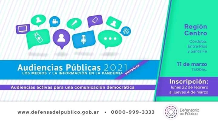 Organizada por la Defensoría del Público de Servicios de Comunicación Audiovisual, la primera audiencia pública del año estará destinada para las provincias de Entre Ríos, Santa Fe y Córdoba. El eje principal del encuentro será “los medios y la información en la pandemia”.