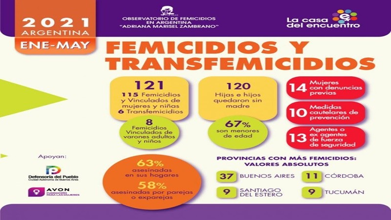 Desde el 1 de enero al 31 de mayo de 2021, se produjeron 115 femicidios, seis transfemicidios y ocho femicidios vinculados de varones en el país, según un nuevo informe del Observatorio de Femicidios en Argentina “Adriana Marisel Zambrano” que dirige La Casa del Encuentro.