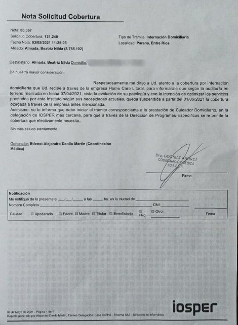 Beatriz Almada es una reconocida y muy querida docente jubilada de Paraná. Padece cáncer y hoy está conectada a oxígeno. Vive sola y desde ayer 1° de junio su obra social, Iosper, le retiró la cobertura de cuidadoras y de su droga de paciente oncológica. Sus familiares solicitaron Ayuda Comunitaria para hacer visible lo que está sucediendo.