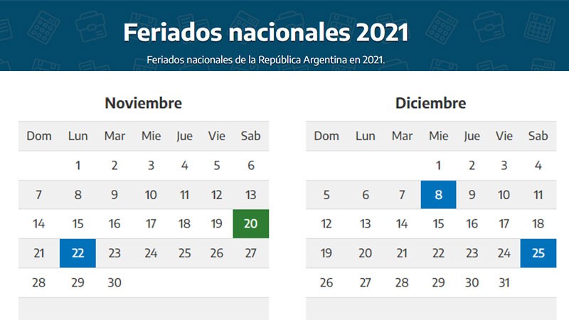 Los próximos feriados del año son el miércoles 8 de diciembre, que no se traslada, por el Día de la Inmaculada Concepción de María; y el del Navidad, el 25 de diciembre, que cae sábado.