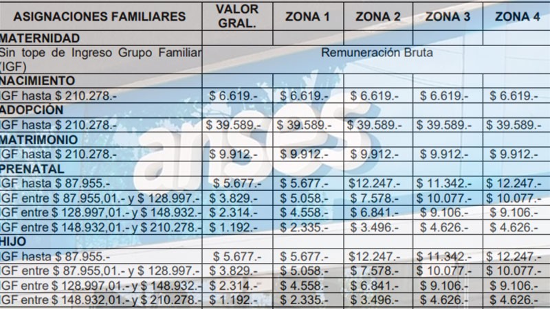 Categorías A, B, C: prenatal e hijo, $ 5.677; por hijo discapacitado, $ 18.494 y ayuda escolar anual $ 4.758.