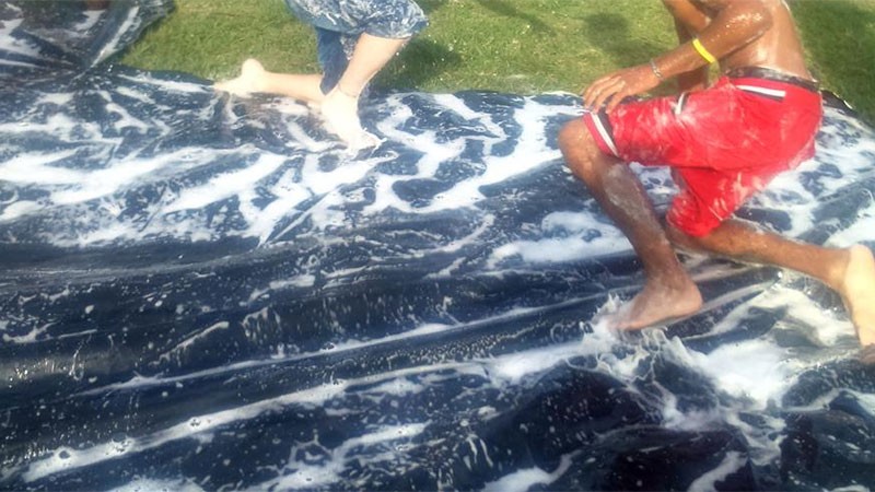 El juego de la lona enjabonada consiste en ponerle jabón a un nylon de silo bolsa y es algo que se realiza sobre todo en zonas rurales, dónde los participantes se arrojan y resbalan en la misma.
