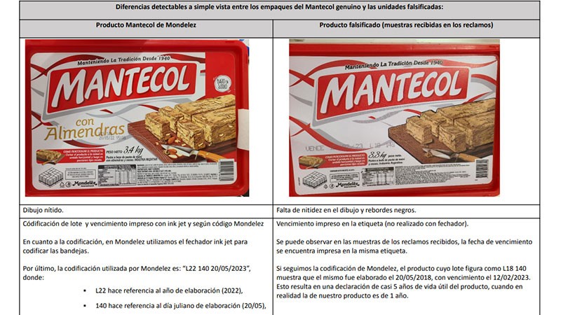En el Boletín Oficial se destaca los distintos elementos entre ambos productos. La golosina falsificada luce diferente contenido neto que el que se comercializa en la actualidad, la imagen del mantecol falsificado es poco nítida con bordes negros, y la denominación del falso dice “Postre a base de pasta de maní y cacao” mientras que el legítimo indica “Postre a base de pasta de maní con almendras y cacao”.