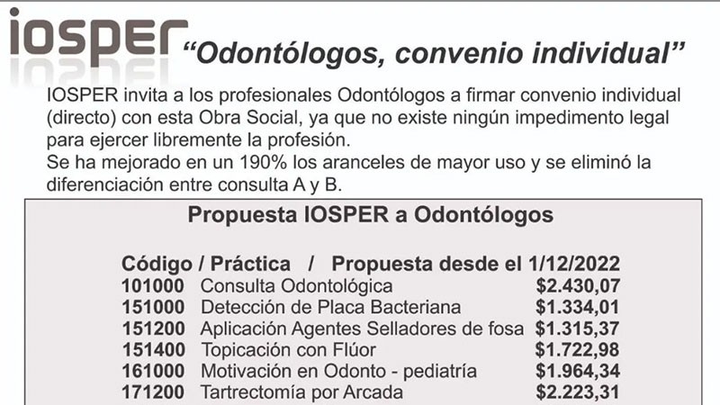 El Instituto Obra Social de la provincia de Entre Ríos (Iosper) diseñó un esquema de aranceles en busca de que los odontólogos, de forma individual, firmen convenios con la obra social provincial y así recuperar una cobertura de la cual hoy carecen sus 300 mil afiliados. “No existe ningún impedimento legal para ejercer libremente la profesión”, remarcó, al tiempo que hizo notar que se “se mejoró 190 por ciento los aranceles de mayor uso”. La consulta odontológica se pagaría $2.430,07.