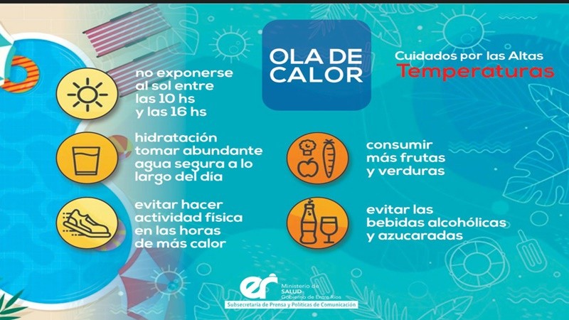 Ante la incidencia de las altas temperaturas, el Ministerio de Salud de Entre Ríos, a través de sus distintas áreas y programas, recomienda: mantener una hidratación adecuada con agua segura (aún sin sed); usar ropas de tejidos livianos y colores claros; e ingerir comidas frescas, sobre todo frutas y verduras.