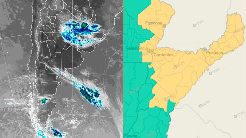 Según el reporte del organismo para las 6.05 de la mañana, el este de Formosa, toda la provincia de Misiones, gran parte de Corrientes y las localidades chaqueñas de Bermejo, General Donovan, Libertad, Primero de Mayo y San Fernando presentan alertas amarillas por tormentas, donde se esperan valores de precipitación acumulada entre 20 y 50 milímetros.