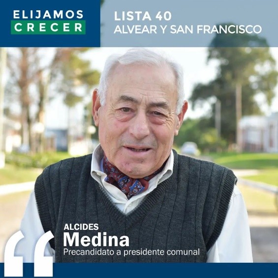 Alcides Medina, pre candidato a presidente comunal por Alvear, fue dueño de un taller mecánico FrenDi en Diamante, hoy actualmente el talle lo tiene a cargo su hijo. Jubilado, residente de Alvear.