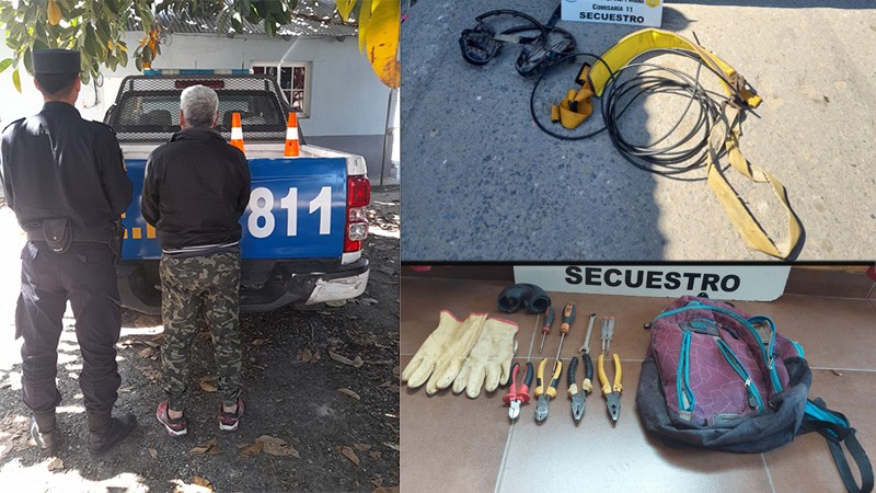 Desde la Fiscalía en turno se dispuso la detención del sujeto de 57 años, su traslado a la Alcaidía de Tribunales y el secuestro de los elementos que tenía en su poder, siendo 9 metros de conductor de cable concéntrico de cobre y de baja tensión 4/4 mm, un juego de trepadoras para utilizar en postes de madera, un cinto de seguridad para trabajo en altura y una mochila que contenía dos buscapolos, dos tenazas, dos pinzas, dos alicates, dos destornilladores, una llave 13 y un par de guantes.