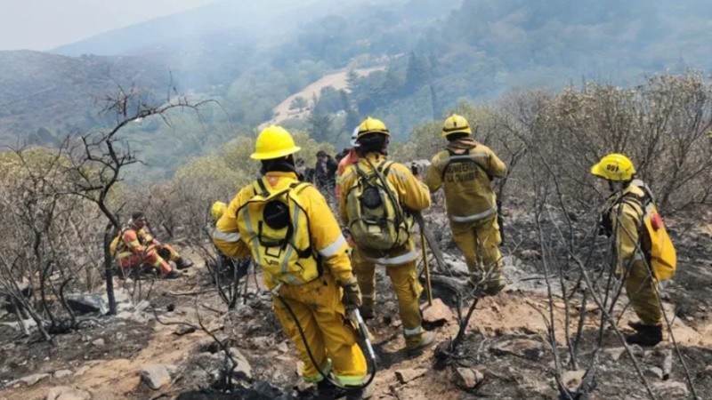 “Sigue activo el foco de la Quebrada de la Mermela. Más de 150 bomberos voluntarios trabajarán toda la noche en la zona, que es de una topografía de muy difícil acceso”, informa el último parte del Gobierno de la provincia.