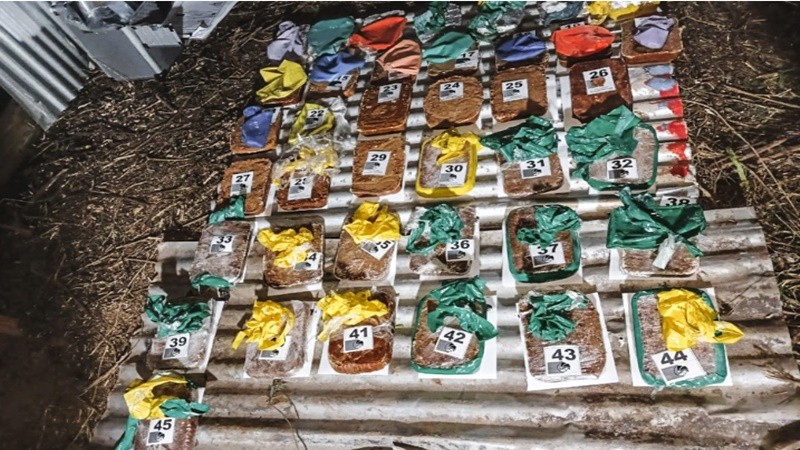 Se secuestraron cerca de 39.800 gramos de pasta base de cocaína, distribuidos en 39 "panes" irregulares; y casi 63 kilos de una sustancia blanca en polvo, negativo para cocaína. Se incautaron además dos fuentones plásticos, seis recipientes plásticos rectangulares, tres bidones con restos de acetona, lidocaína, y una prensa metálica.