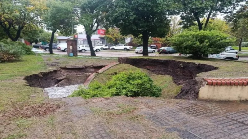 El hundimiento se produjo en un cantero ornamental ubicado frente al edificio de los monoblocks, en la intersección de las calles Rivadavia y Belgrano, en momentos en que se registraban intensas lluvias.